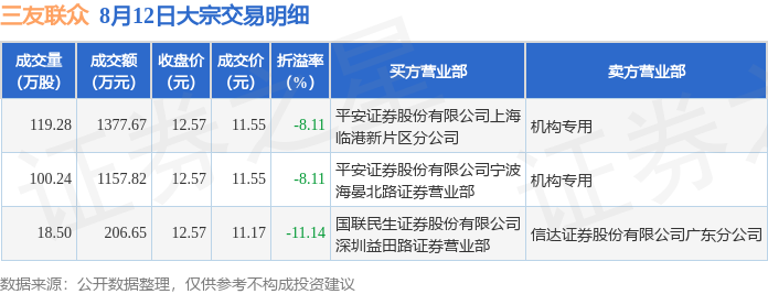 8月12日三友联众现1笔折价11.14%的大宗交易 合计成交2742.14万元
